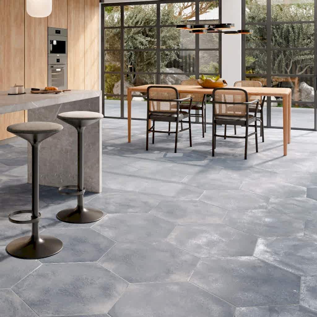 Our Atelier Blue Hexagon Tiles are the epitome of style and practicality. Crafted from durable porcelain, these tiles feature a captivating concrete effect in a stunning shade of blue, making them the ideal choice for enhancing both walls and floors.