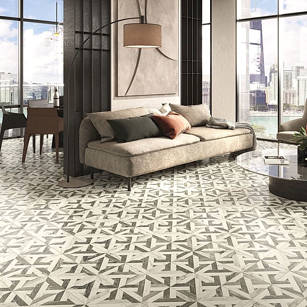 The classic black and white pattern creates a captivating geometric marble motif, adding a touch of sophistication to your space. Crafted from high-quality porcelain, they feature a satin/lappato finish that exudes a subtle luxury.