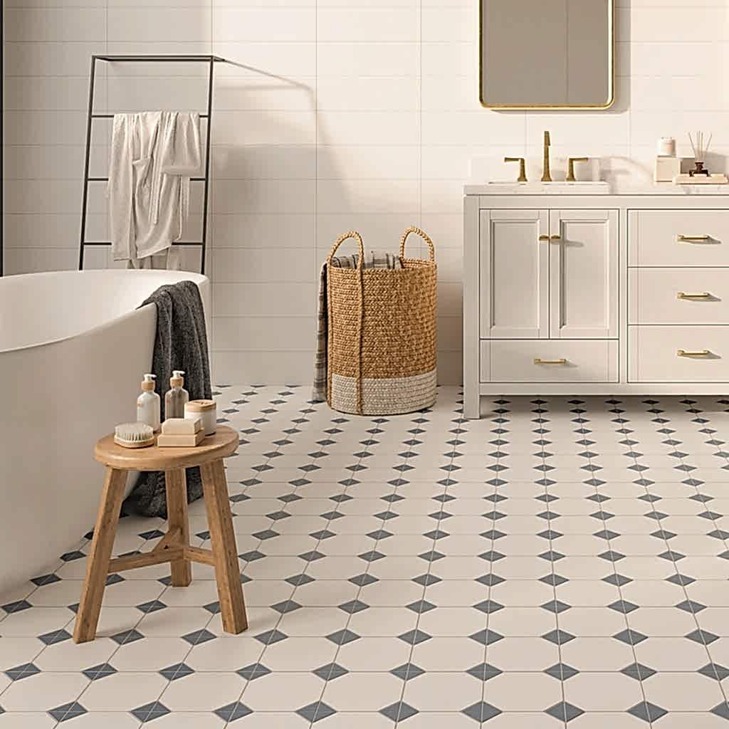 Add a fresh twist to classic flooring with the Canterbury Blue Octagon Tiles. The timeless octagon-and-diamond pattern gets a gentle pop of colour here, pairing white octagons with soft blue diamond insets for a look that’s clean, calm and full of personality.
