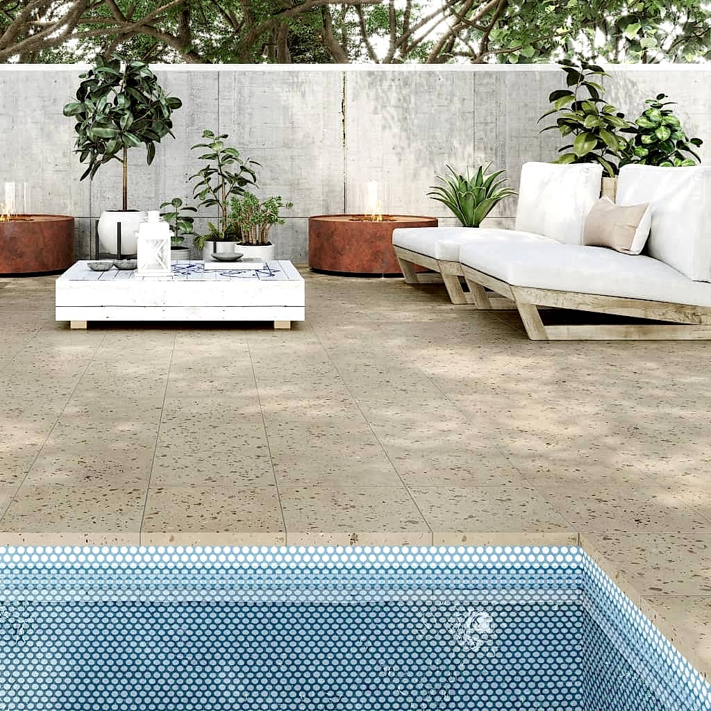 Transform your garden, terrace or patio into an Italian haven with Carnival terrazzo outdoor tiles, featuring a soft beige tones and designer terrazzo style flakes. Made from hardwearing quality porcelain and with a sophisticated matt finish, these beautiful tiles, which are slightly deeper than most tiles at 14mm deep, are perfect for the British outdoors.