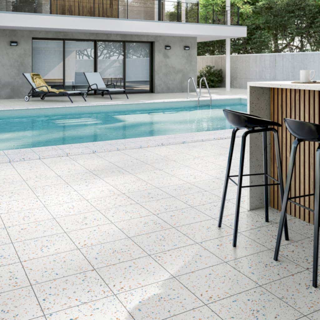 Add some timeless elegance into your outdoor spaces with the Italian inspired Carnival cream terrazzo tiles, featuring soft white tones and an array of colourful terrazzo style flakes. Made from hardwearing quality porcelain and with a sophisticated matt finish, these beautiful cream terrazzo tiles, which are slightly deeper than most tiles at 14mm deep, are perfect for gardens and patios in the Britsh weather.