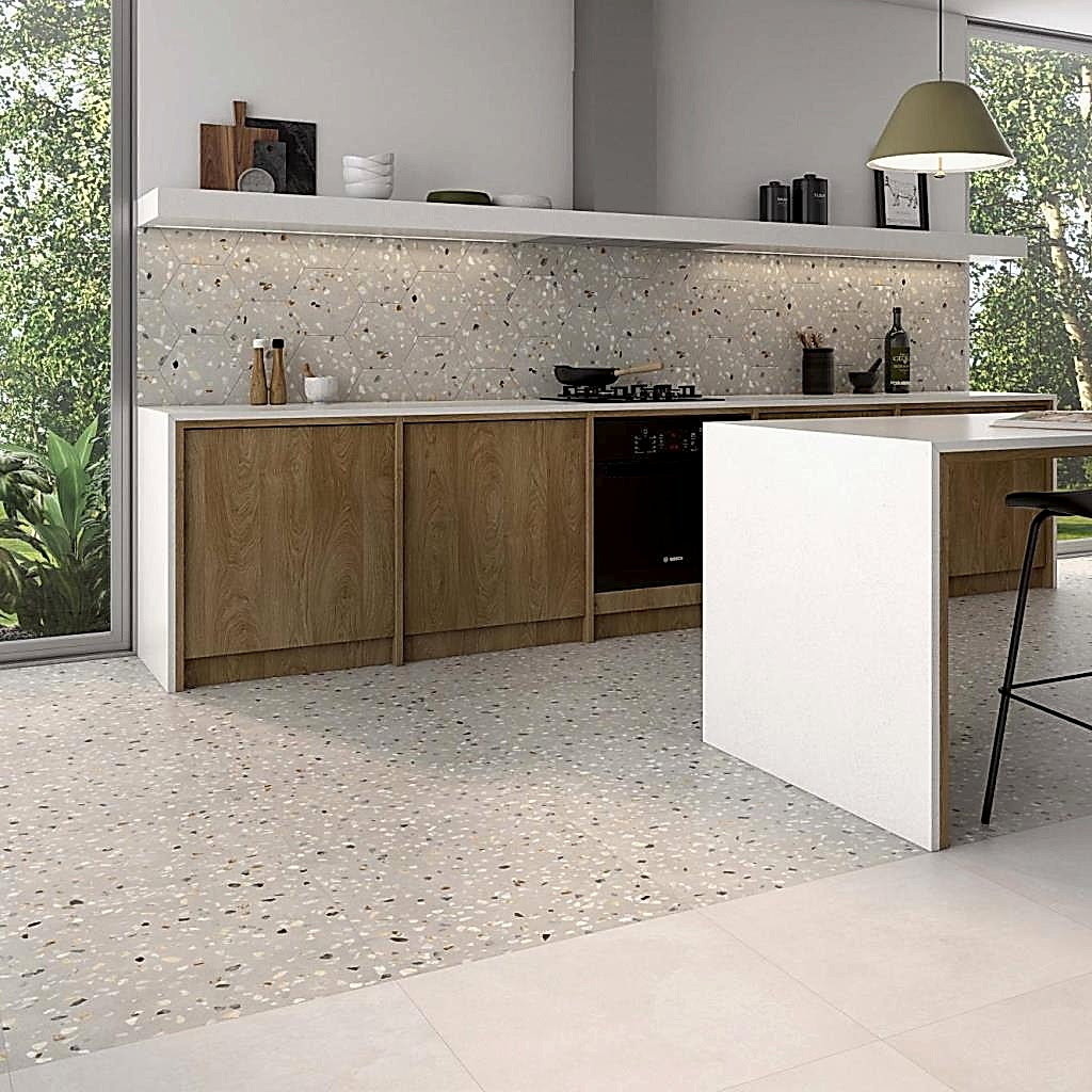 Create a luxury, Italian inspired design with these stylish Doria grey terrazzo tiles which have been designed for use on both walls and floors. Made from hardwearing quality porcelain and with a sophisticated matt finish, these beautiful tiles can be used on their own or teamed with other tiles such as the grey hexagon terrazzo tile. With precision cut straight edges, which facilitates narrow grout lines and in a modern 60 x 60 format, they are perfect for open plan living areas where an elegant seamless design is desired. They also feature a useful R10 anti slip surface, which is ideal for hallways, kitchens and bathrooms. For free tile samples and tiling advice such as grout colour ideas, please contact the Direct Tile Warehouse team.