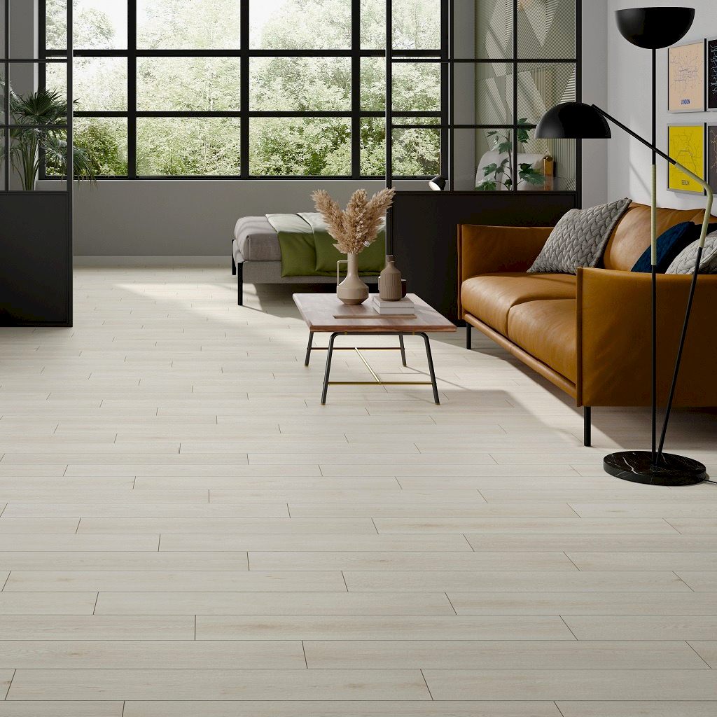 Our Nordby White Porcelain Wood Tile Flooring is a stunning blend of elegance and durability for your space.
