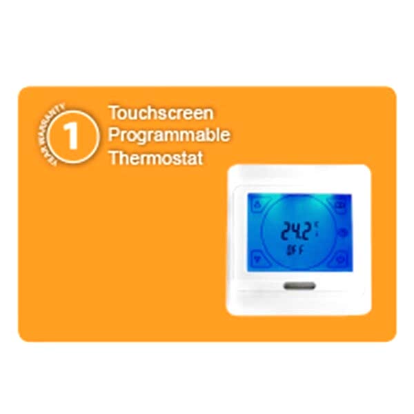 The cable and mat underfloor heating systems come with a choice of 2 electric underfloor heating controls; the cost-effective standard thermostat and this stylish touchscreen version. Both thermostats are programmable and use precise floor and air temperature control to provide you with a simple and efficient way to manage your system, providing comfort and reduced energy costs.