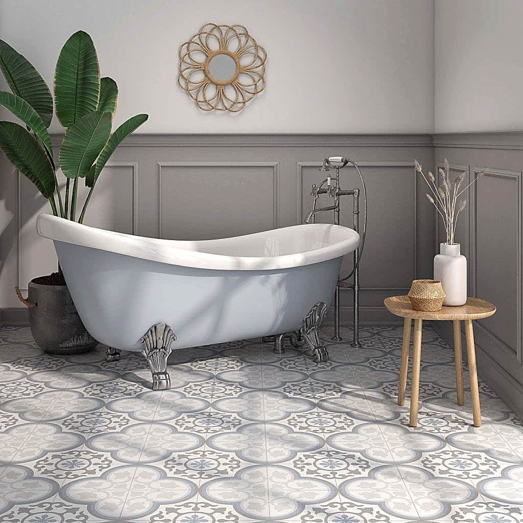 Our deluxe Victorian Patterned Floor Tiles can adorn walls and floors with traditional beauty. With stunning details, the light blue and grey reflect the meticulous craftsmanship of the Victorian period.