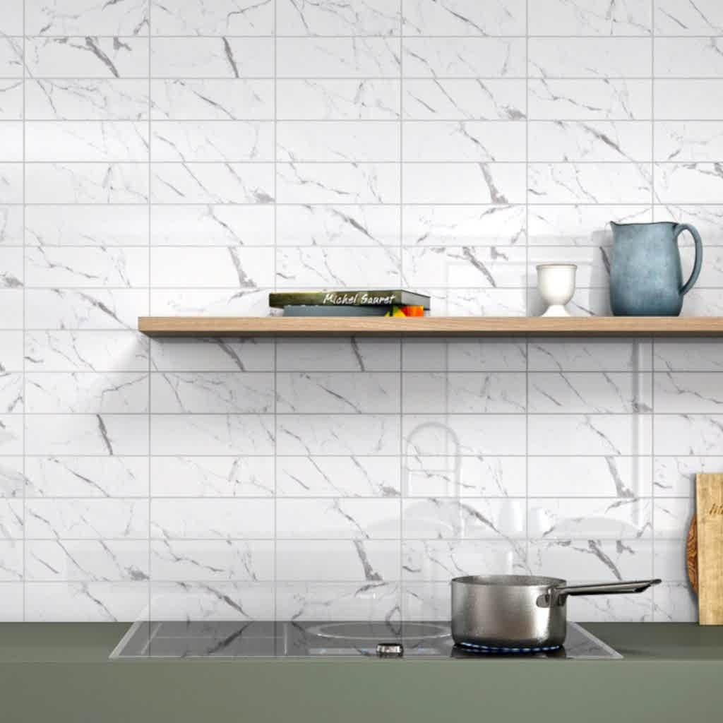 Their flat profile and glossy finish elevate the marble effect, exuding refined elegance on your walls. With dimensions of 10cm x 30cm, these versatile white marble metro tiles are perfect for residential and commercial spaces, enhancing kitchens, bathrooms, or living areas.